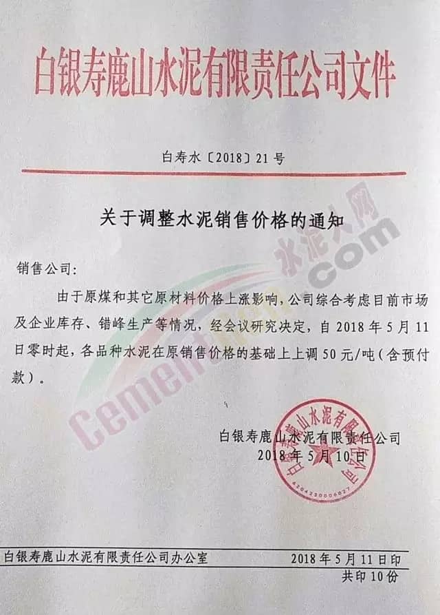 白銀壽鹿山水泥有限責(zé)任公司調(diào)價(jià)通知稱:由于原煤和其他原材料價(jià)格上漲影響,公司綜合考慮目前市場及企業(yè)庫存、錯(cuò)峰生產(chǎn)等情況,經(jīng)會(huì)議研究決定 ,自5月11日零時(shí)起,各品種水泥在原銷售價(jià)格的基礎(chǔ)上上調(diào)50元/噸(含預(yù)付款)
