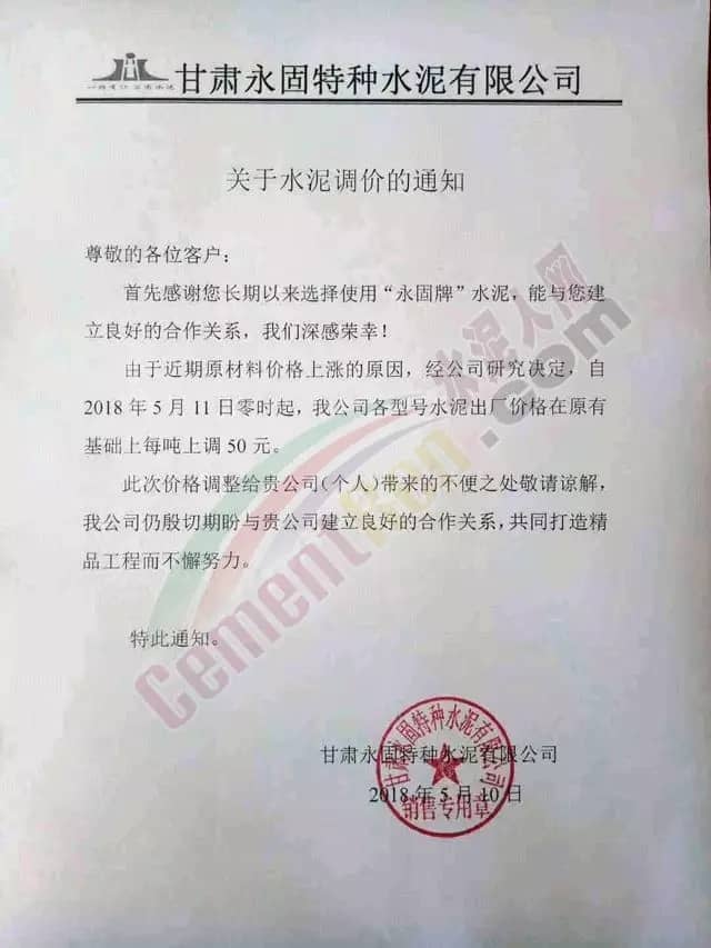 甘肅永固特種水泥有限公司調(diào)價(jià)通知稱,由于近期原材料價(jià)格上漲原因,經(jīng)公司研究決定自5月11日零點(diǎn)起,各型號(hào)水泥出廠價(jià)格在原基礎(chǔ)上上調(diào)50元/噸。