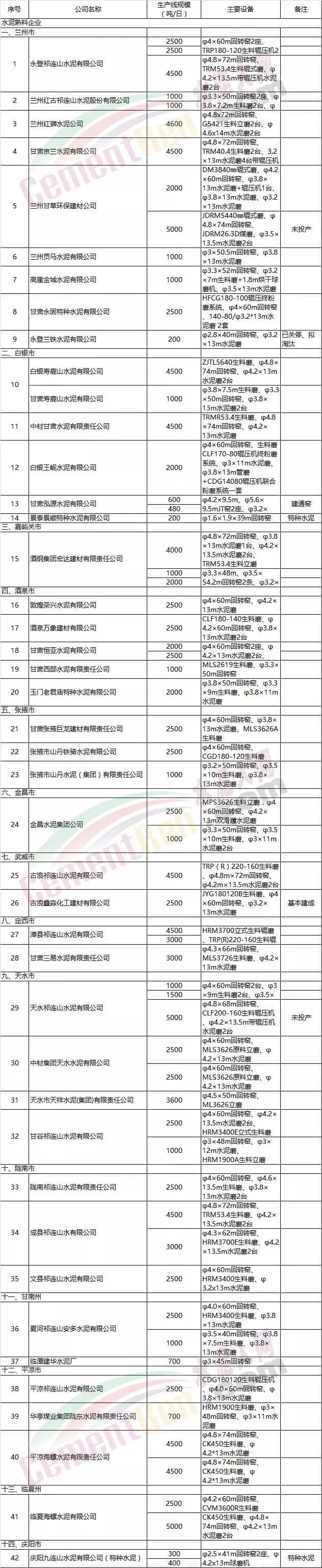 備注:數(shù)據(jù)來源水泥人網(wǎng)信息中心,表中設(shè)計(jì)產(chǎn)能為4500t/d熟料生產(chǎn)線多已技改完成,現(xiàn)日產(chǎn)量在5000t/d以上;2500t/d熟料生產(chǎn)線除永登祁連山兩條2500t/d熟料生產(chǎn)線外,其他均已技改完成,日產(chǎn)量在3000t/d以上。