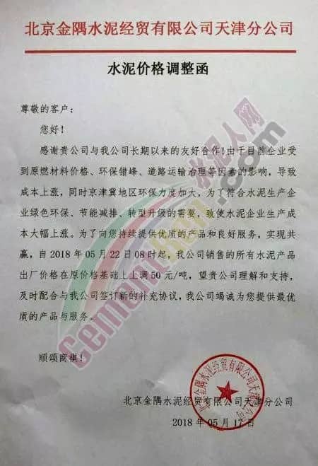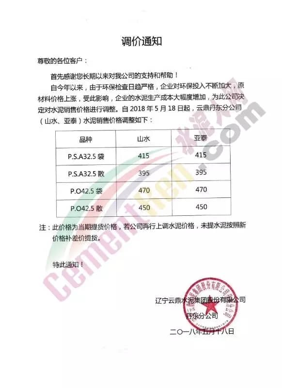 寧夏賽馬水泥關于調整水泥銷售價格的通知稱:因原材料價格上漲,自2018年5月17日起所有品種規格水泥價格上調30元/噸。其他水泥企業調價通知調價原來與此類似。