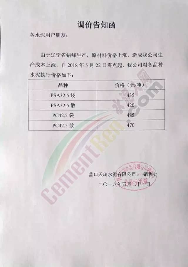 昨日下午,營口天瑞水泥發布調價告知函稱,由于遼寧省錯峰生產,原材料價格上漲,造成公司生產成本上漲,自今日(22日)零點起各品種水泥執行新價格體系。