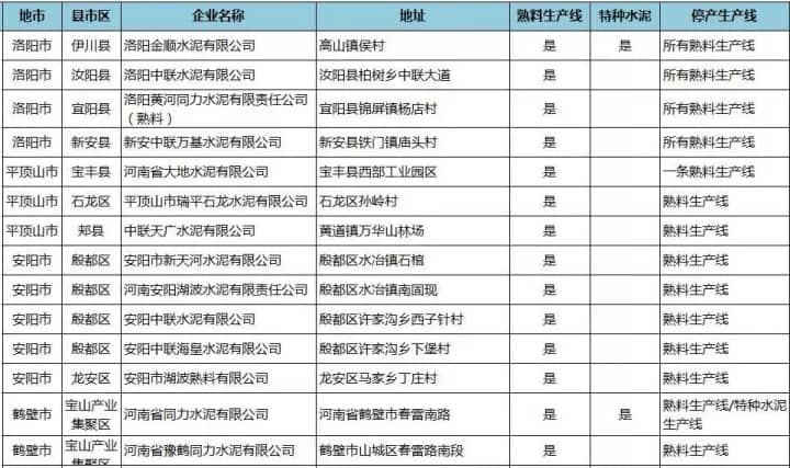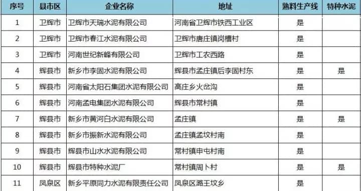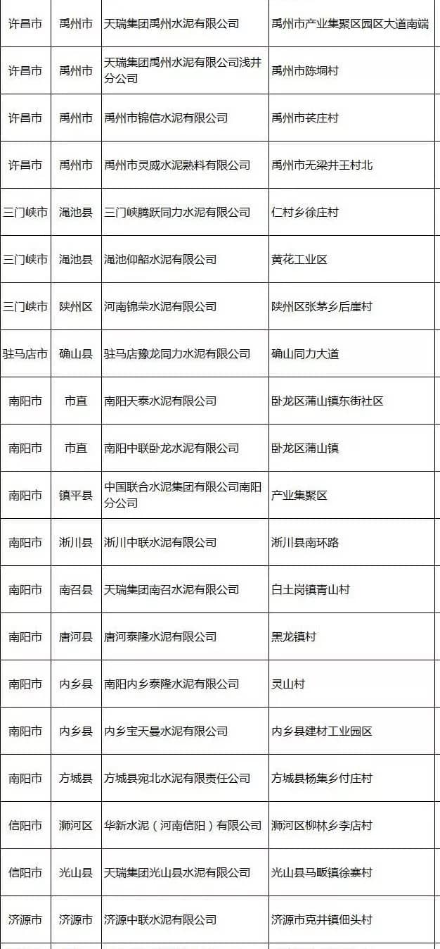 河南省水泥企業(yè)名單(含特種水泥)