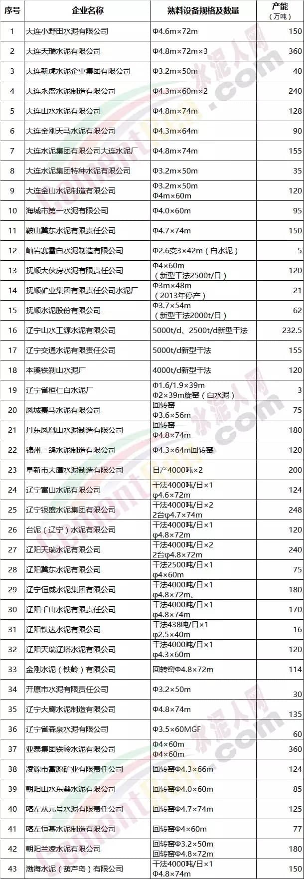 遼寧省水泥企業(yè)名單(43家)