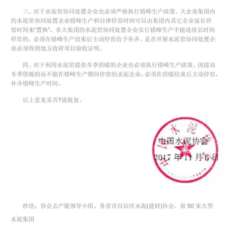 去年11月6日中國(guó)水泥協(xié)會(huì)向工信部原材料司發(fā)出《關(guān)于全面推行水泥錯(cuò)峰生產(chǎn)的請(qǐng)示》,表示錯(cuò)峰生產(chǎn)作為減少污染排放量疊加的環(huán)境政策,是對(duì)所有從事水泥制造的企業(yè)(熟料生產(chǎn)企業(yè)、水泥粉磨站企業(yè))提出的要求,所有水泥企業(yè)都必須無(wú)條件的執(zhí)行錯(cuò)峰生產(chǎn)政策。