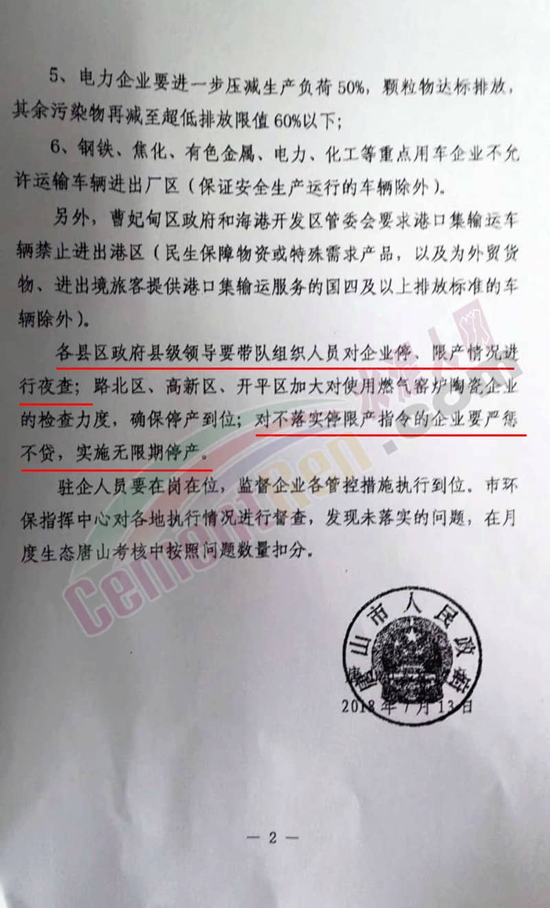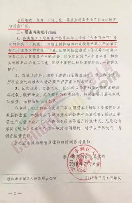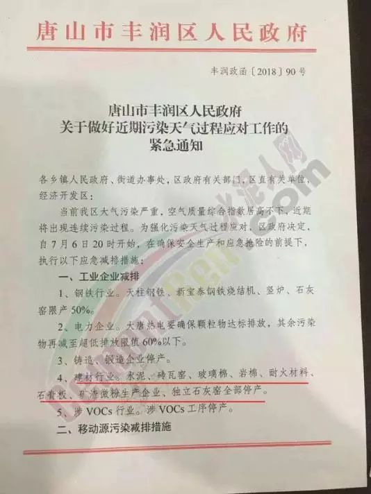 此次唐山市政府為何發出如此嚴厲的文件,不得不從前幾日的停產文件說起,7月6日唐山市豐潤區人民政府發布關于做好近期污染天氣過程應對工作的緊急通知,要求豐潤區所屬水泥企業全部停產(文件如下):