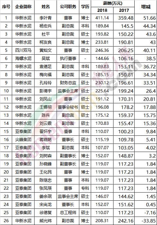 其中亞泰集團有14位高管年薪過百萬,華新水泥有13位高管年薪過百萬。是百萬年薪最多的水泥企業。