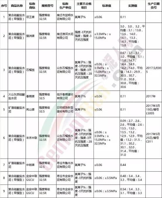 江蘇省工商行政管理局官網公布了上年第一階段水泥抽檢結果,被檢測的42組樣品中,不合格組9個,不合格率為21.4%。不合格項目為強度不夠和氯離子超標。