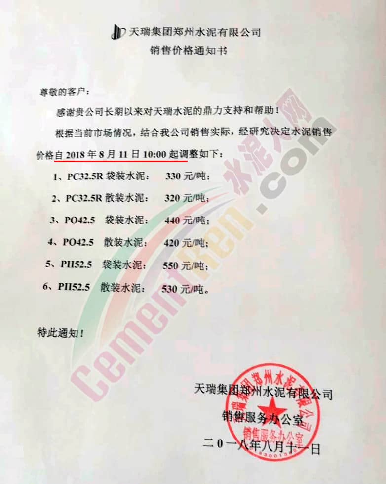 其中:天瑞集團鄭州水泥有限公司銷售價格通知書稱,根據當前市場情況,結合公司銷售實際,決定上調水泥銷售價格,自8月11日10點起執行新價格。