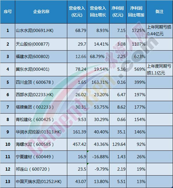 部分水泥上市企業(yè)半年報(bào)業(yè)績(jī)排行榜