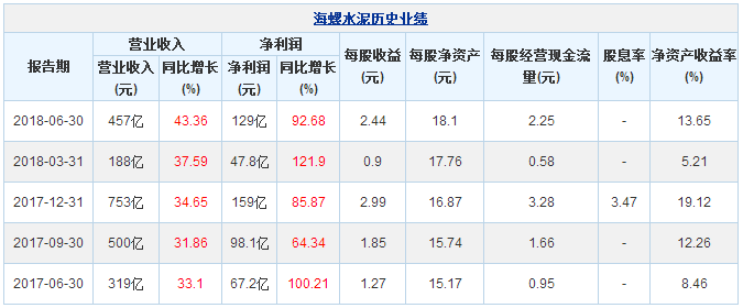 昨日(22日),海螺水泥、冀東裝備分別發(fā)布2018年半年報(bào)。海螺水泥發(fā)布2018年中報(bào)顯示,其營(yíng)業(yè)收入457億元,同比增長(zhǎng)43.36%;歸屬于上市公司股東的凈利潤(rùn)129億元,同比增長(zhǎng)92.68%。基本每股收益2.44元;冀東裝備公布2018年中報(bào)顯示,其營(yíng)業(yè)收入8.04億元,同比下降8.27%;歸屬于上市公司股東的凈利潤(rùn)2080萬(wàn)元,同比增長(zhǎng)323.8%。