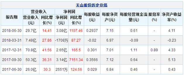 天山股份8月10日最新公布的2018年中報(bào)顯示,其營(yíng)業(yè)收入29.7億元,同比增長(zhǎng)14.41%;歸屬于上市公司股東的凈利潤(rùn)3.08億元,同比增長(zhǎng)1107.46%。