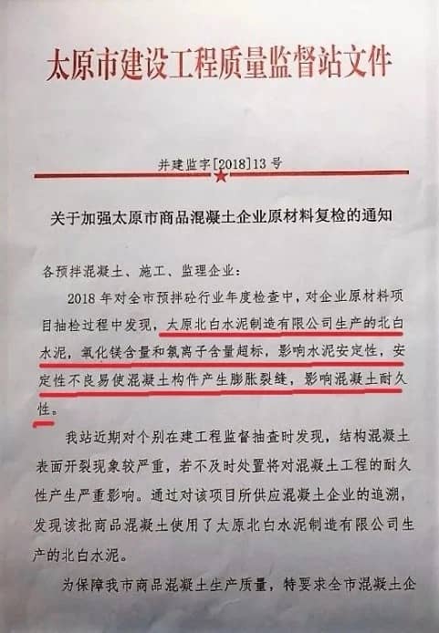 山西省太原市建設工程質量監督站此前發布的《關于加強太原市商品混凝土企業原料復檢的通知》稱,在2018年對全市預拌砼行業年檢時發現,太原北白水泥制造有限公司生產的北白水泥,氧化鎂含量和氯離子含量超標,影響水泥安定性,安定性不良易使混凝土構件產生膨脹裂縫,影響混凝土耐久性。