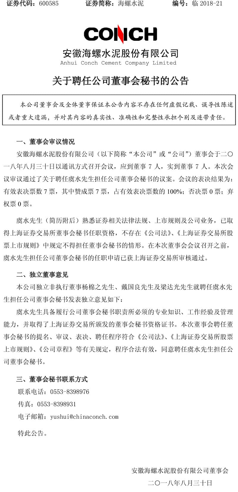 【水泥人網】海螺水泥(00914)8月30日晚間公告,虞水已獲委任為公司聯席公司秘書,任命于2018年8月30日生效。虞水生將與公司現時的公司秘書趙不渝共同出任聯席公司秘書職務。虞水亦獲委任為董事會秘書,任命于2018年8月30日生效。