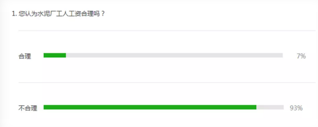 先讓我們回顧一下前幾日水泥人網微信公眾平臺發起的您認為水泥廠工人工資合理嗎?的民意調查吧,在短短的1天的時間內,有近萬人參與了投票,根據奮斗在一線的水泥工人投票結果顯示,有93%的人認為一線工人工資不合理,剩余7%的工人認為工資是合理的。