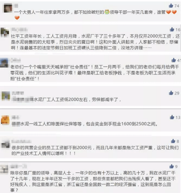 薪資問題永遠是一個熱門問話題,因水泥行業的薪資太低,普通員工薪資在1500~3000元/月不等。有網友留言“一個大男人一年往家拿兩萬多,都不如撿破爛的。”; “一線員工,忍著高溫、噪音、粉塵的危害實在不容易”;“這個確實是血汗錢,夏天熱死,冬天冷死”。水泥行業生產一線工人的苦累自不必多言。