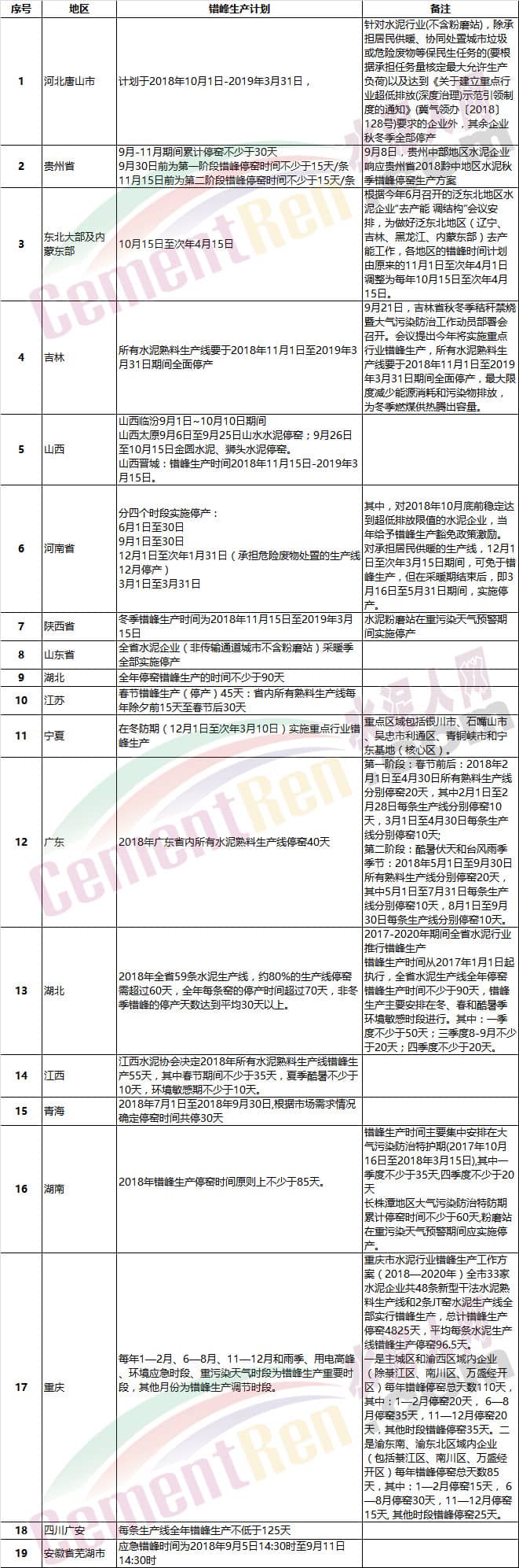 北京、天津、河北、山西、內(nèi)蒙古、遼寧、吉林、黑龍江、山東、河南、陜西、甘肅、青海、寧夏、新疆等15個(gè)省(自治區(qū)、直轄市)所有水泥生產(chǎn)線,包括利用電石渣生產(chǎn)水泥的生產(chǎn)線都應(yīng)進(jìn)行錯(cuò)峰生產(chǎn)。