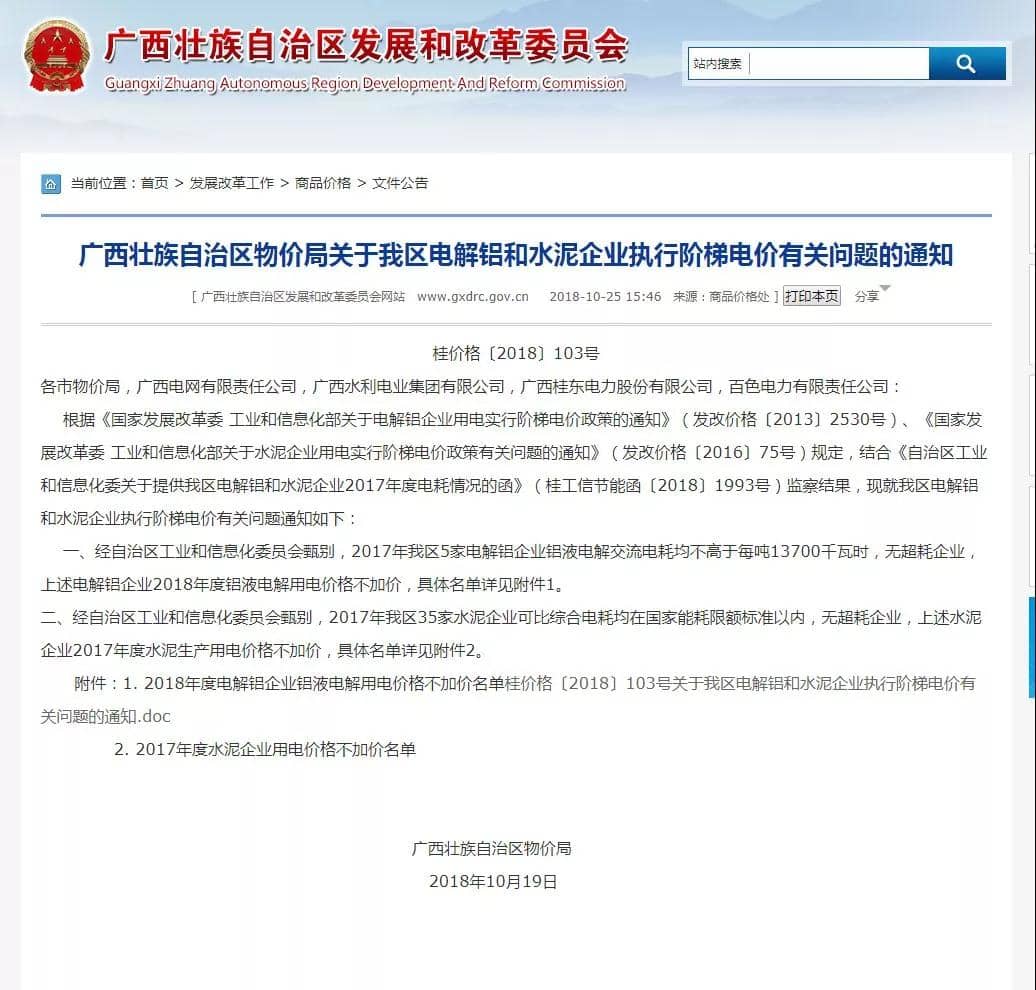 日前,廣西壯族自治區物價局發布關于水泥企業執行階梯電價有關問題的通知。通知稱,根據《國家發展改革委 工業和信息化部關于電解鋁企業用電實行階梯電價政策的通知》(發改價格〔2013〕2530號)、《國家發展改革委 工業和信息化部關于水泥企業用電實行階梯電價政策有關問題的通知》(發改價格〔2016〕75號)規定,結合《自治區工業和信息化委關于提供我區電解鋁和水泥企業2017年度電耗情況的函》(桂工信節能函〔2018〕1993號)監察結果,就廣西壯族自治區水泥企業執行階梯電價有關問題做如下通知。 通知原文: 來源:廣西壯族自治區發改委