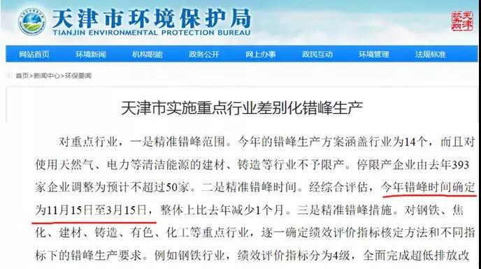 根據《天津市重點行業采暖季差異化錯峰生產績效評價指導意見》要求,方案要求,在2018-2019年采暖季期間(2018年11月15日至2019年3月15日),我區對鋼鐵、建材、焦化、鑄造、有色、化工等高排放行業,結合我市產業結構實際和企業污染排放績效情況,實行差別化錯峰生產,不搞“一刀切”。