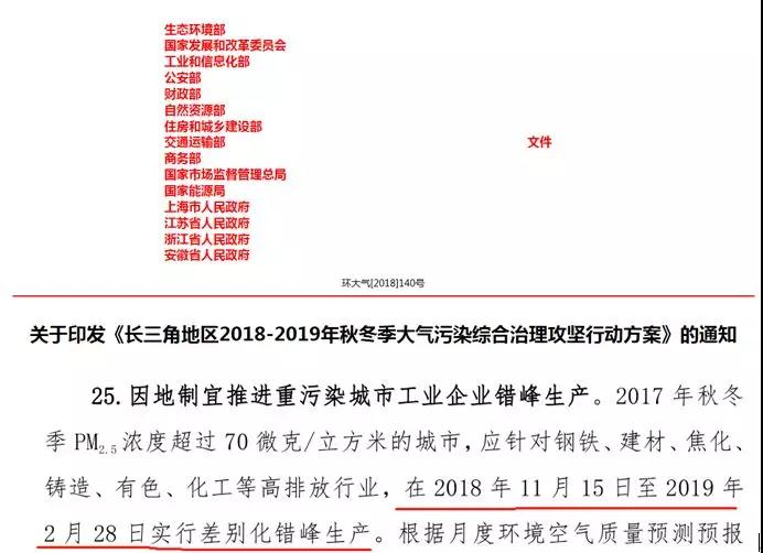 河南省污染防治攻堅戰領導小組辦公室發布《河南省重點行業差異化錯峰生產指導意見的通知(報批稿)》和《關于印發河南省2018-2019年秋冬季大氣污染綜合治理攻堅行動方案的通知》,其中提到,2018年11月15日至2019年3月15日,將重點對全省鋼鐵、焦化、鑄造、建材、有色、醫藥(農藥)等行業實施差異化錯峰生產。