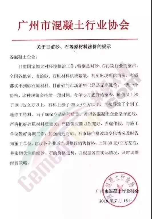 信件指出,“水泥企業無序漲價,引發市場混亂”,“且告知混凝土企業,如不在漲價函上簽字確認,將予以停止水泥供應,此舉還從側面引發了預拌混凝土其他原材料(如粉煤灰、礦粉等)的漲價趨勢,對本來已經岌岌可危的混凝土企業造成致命一擊。”
