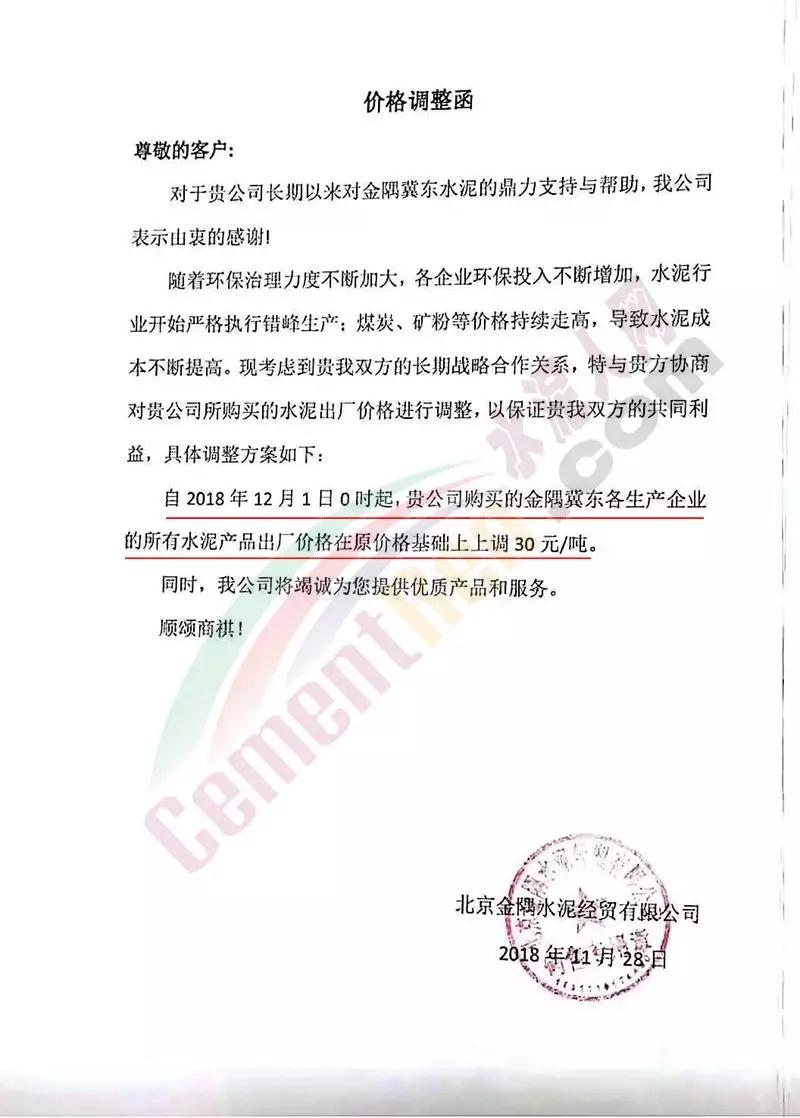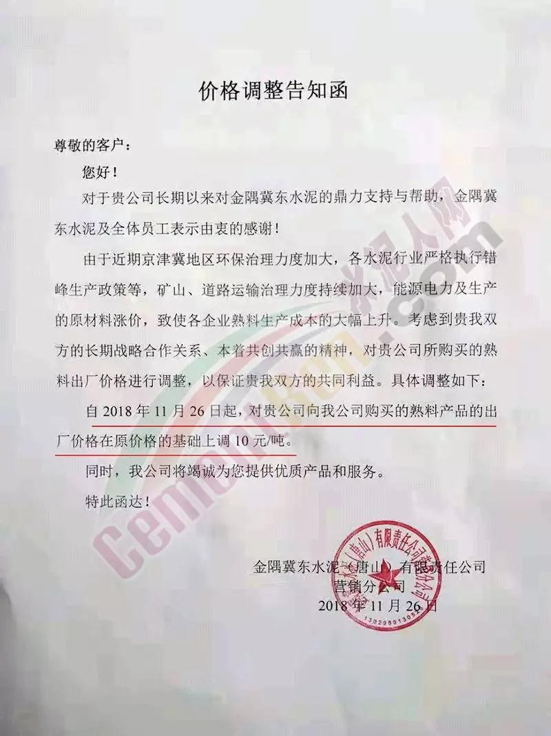 日前,華北地區主導企業金隅冀東水泥集中發布調價通知。其中,北京金隅經貿有限公司調價通知稱,隨著環保治理力度不斷加大,各企業環保投入不斷增加,水泥行業開始嚴格執行錯峰生產。同時,煤炭、礦粉等價格持續走高,導致水泥成本不斷提高。企業將于12月1日起上調各生產企業的所有水泥產品出廠價格,上調幅度30元/噸。