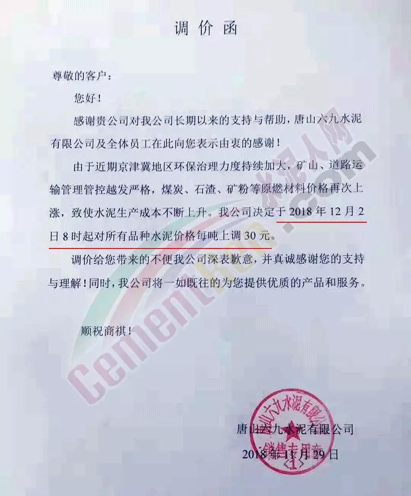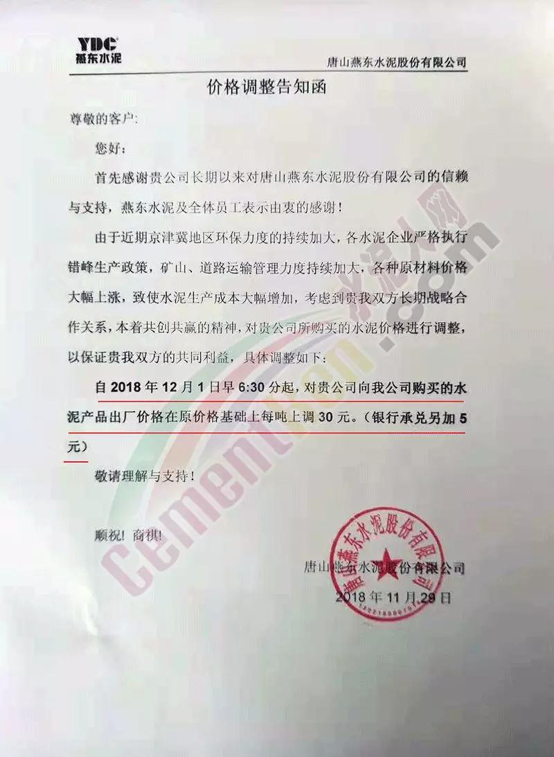 同期唐山燕東水泥,唐山泓泰水泥,六九水泥也跟隨發布了調價通知,稱自下月初起上調了水泥出廠價格,上調幅度30元/噸。