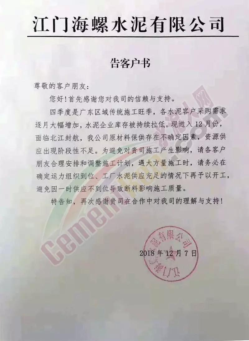 近日江門海螺水泥發布斷貨風險提示,由于下游需求旺盛,水泥庫存持續拉低,面臨北江封航,資源供應出現階段性不足,發布預警提醒(如下圖)