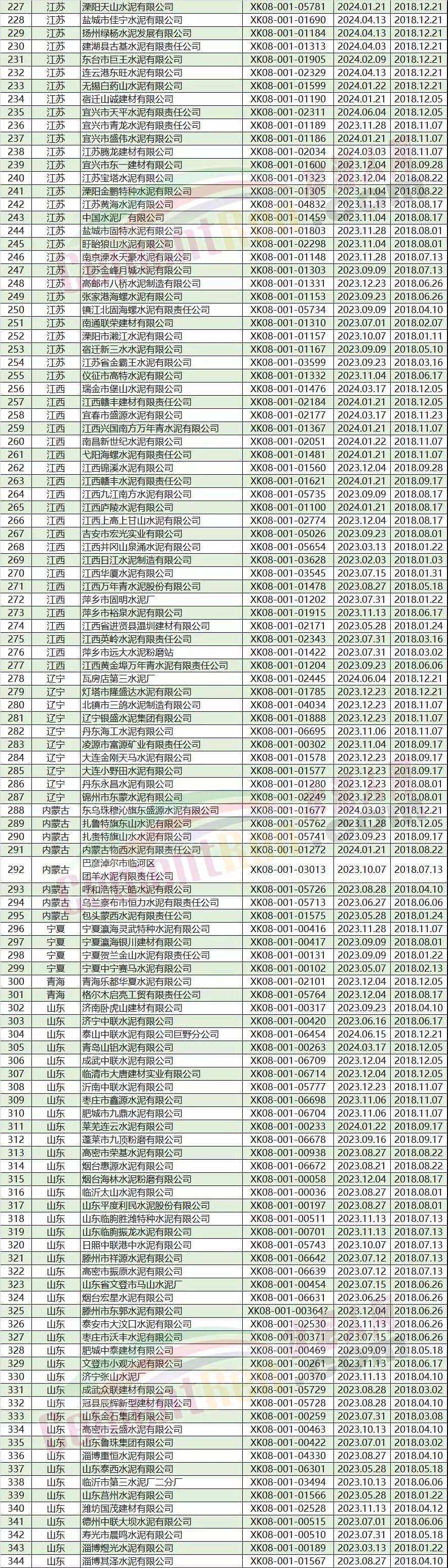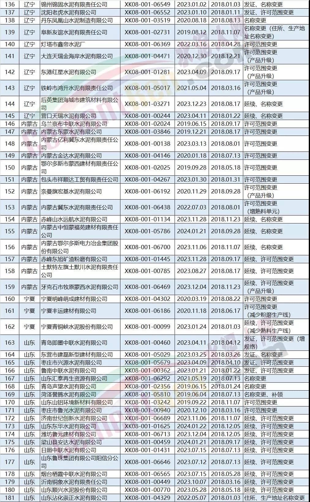 內蒙、山西、河北各發放10個編號水泥企業生產許可證。福建、甘肅 、廣西、寧夏、青海 、新疆、貴州、河南 、湖南、湖北、浙江、上海、遼寧、吉林、黑龍江、江蘇、江西、山東、陜西、四川等區域也有新發證書。