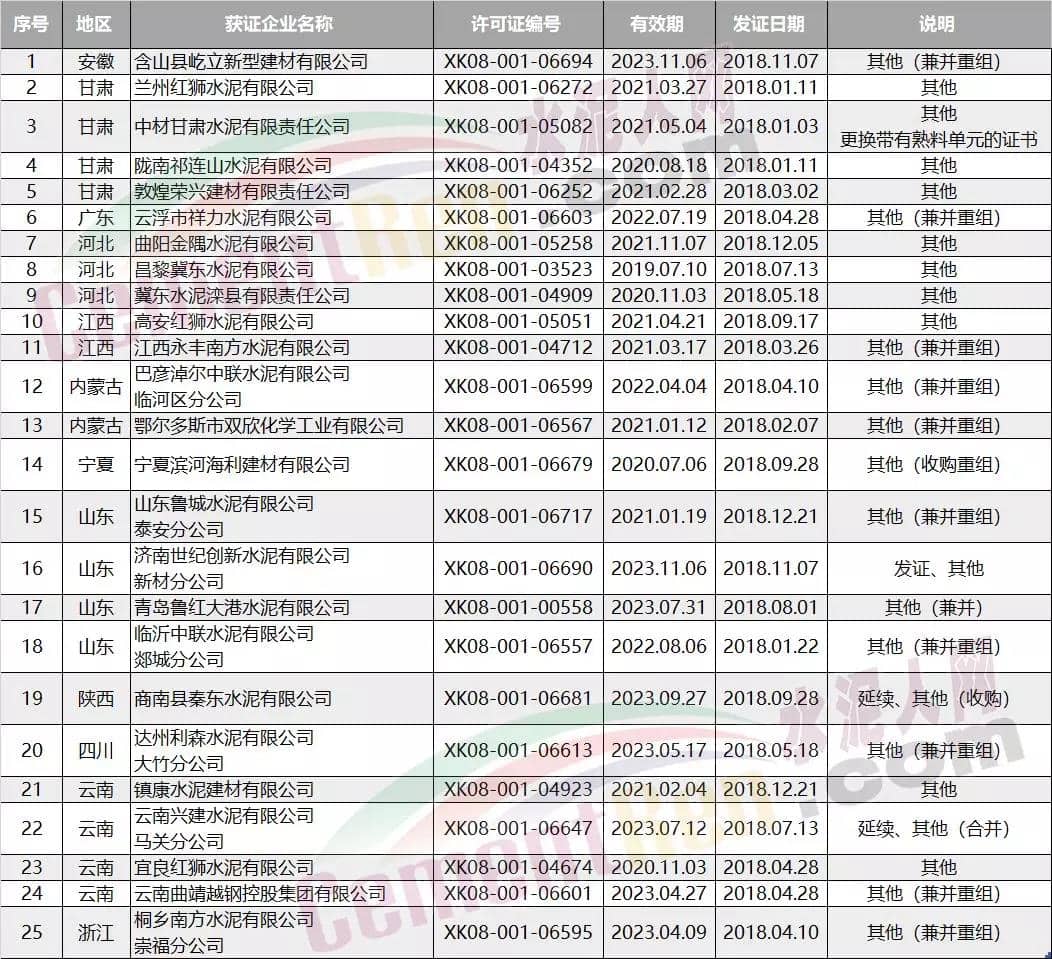 據水泥人網了解新版《水泥產品生產許可證實施細則》于2018年12月1日正式實施。上述列表中的153家企業,有一部分是因證書到期未延續被注銷后又重新申請的,還有一部分是新建生產線第一次申領水泥產品生產許可證書。詳情如下: