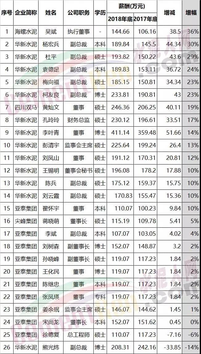 從上表可見,近兩年來年薪增幅最高的是海螺集團總經理吳斌,增幅達36%,上表中26位上市企業高管中有15位年薪漲幅達到10%以上。