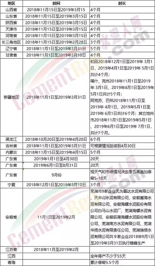 水泥人網小編注意到2018年-2019年采暖季錯峰停產還沒有結束,新的錯峰停產計劃就發布了,是否停產天數包括重疊部分文件并沒有做詳細說明,如果包括重疊部分,那是否各省新的一年里錯峰停產天數在減少。從另外一個角度看,從2019年3月15日開始,北方兩千多家水泥企業將進入集體開窯的壯觀場面。