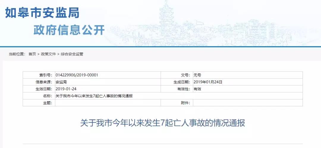 7.2019年1月18日14時(shí)左右,位于九華鎮(zhèn)的如皋市龍珠服裝有限公司在生產(chǎn)作業(yè)時(shí),發(fā)生一起高處墜落事故,造成1人死亡。
