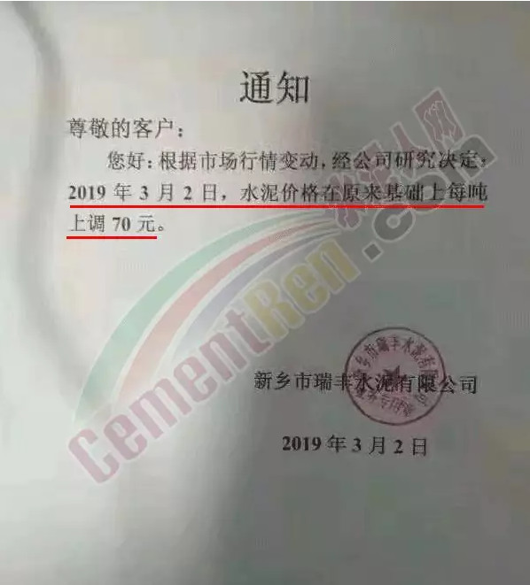 新鄉(xiāng)市瑞豐水泥有限公司調(diào)價(jià)函