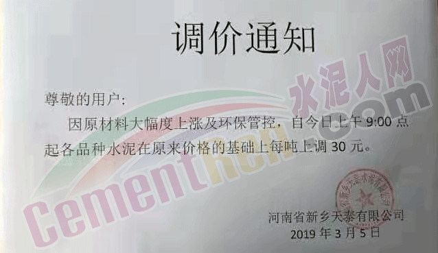 3月5日河南省新鄉(xiāng)天泰有限公司發(fā)布調(diào)價(jià)通知稱,因原材料大幅度上漲及環(huán)保管控,自3月5日上午9:00起各品種水泥在原價(jià)格基礎(chǔ)上每噸上調(diào)30元/噸。