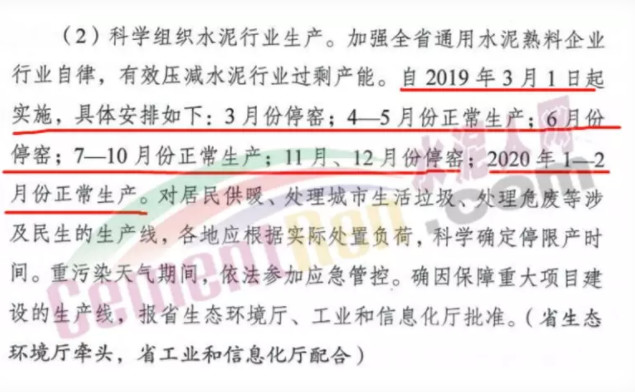 文件要求水泥行業科學組織生產,加強水泥熟料企業自律,有效壓減水泥行業過剩產能。自3月1日起停窯限產,4、5月正常生產,6月停限,7-10月正常生產,11、12月停窯。共計停限4個月,加上2019年1、2月份的停窯限產,河南省2019年也要停限產6個月(180天)以上。