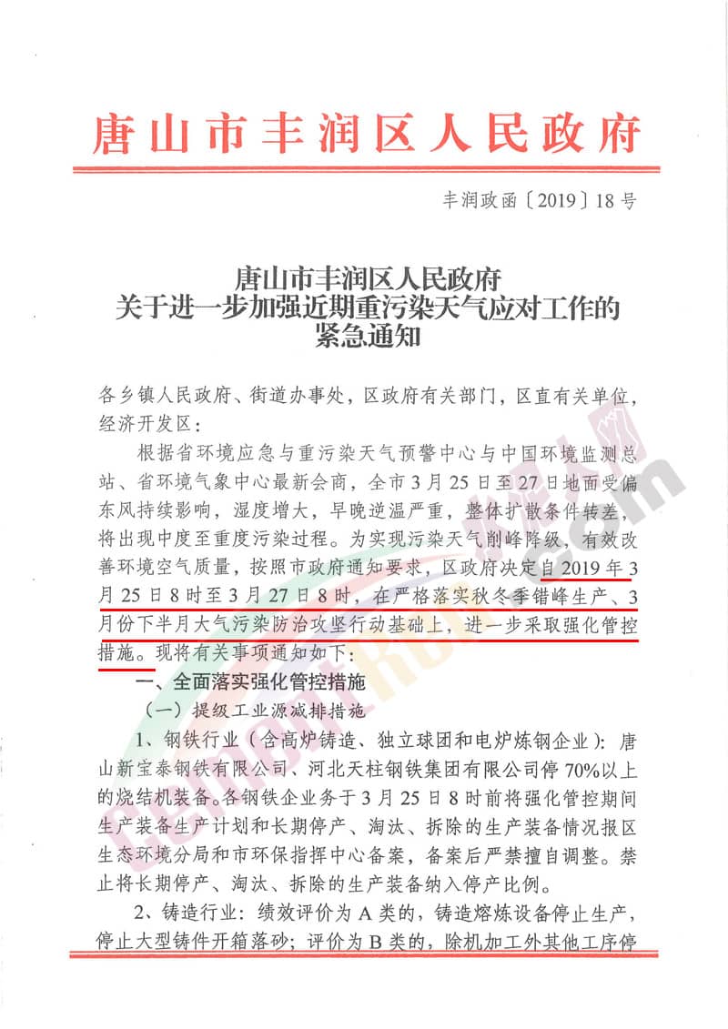 河北省唐山市,這個京津冀地區的“水泥窩”,一遇到重污染天氣就發布緊急通知。昨日(3月25日),唐山市豐潤區人民政府發布豐潤政函【2019】18號文件《關于進一步加強近期重污染天氣應對工作的緊急通知》要求自3月25日至3月27日,在嚴格落實秋冬季錯峰生產,3月份下半月大氣污染攻堅行動基礎上,進一步采取強化管控措施。