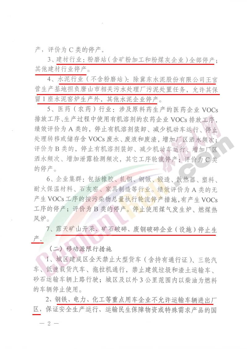 其中,建材行業,粉磨站(含礦粉加工和粉煤灰企業)全部停產;其他建材行業停產。水泥行業(不含粉磨站),除冀東水泥股份有限公司王官營生產基地擔負相關污泥處置任務,允許其保留一座水泥窯爐生產外,其他水泥企業停產。露天礦山開采,礦石破碎,等企業設施停產。