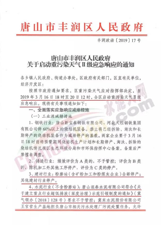 上個月底,2月28日唐山市人民政府曾發布《關于啟動重污染天氣Ⅰ級應急響應的通知》要求建材行業。粉磨站停產;水泥行業(不含粉磨站)。符合《關于建立重點行業超低排放(深度治理)示范引領制度的通知》(冀氣領辦〔2018〕128號)要求的,不予管控;協同處置城市垃圾(含污泥)或危險廢物等保民生任務的,可根據承擔任務量核定最大允許生產負荷生產;承擔居民供暖的,根據承擔任務量核定最大允許生產負荷生產。其他企業停產。