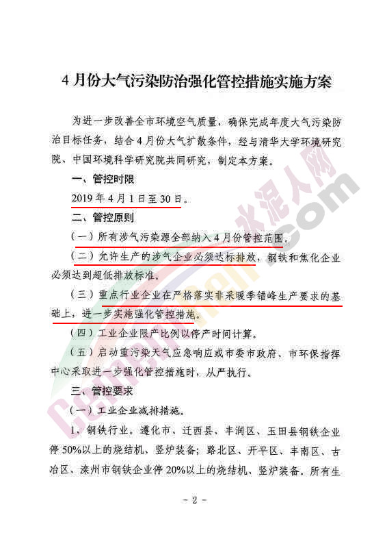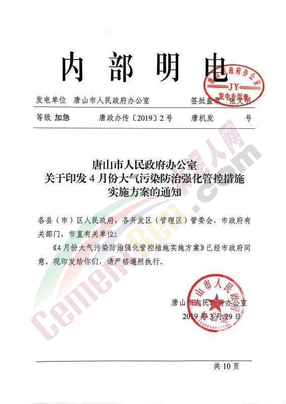 水泥人網最新消息:日前,唐山市人民政府辦公室發布內部明電唐政辦傳【2019】2號《關于印發4月份大氣污染防治強化管控措施實施方案的通知》稱,《4月份大氣污染防治強化管控措施實施方案》已經市政府同意。