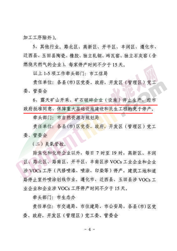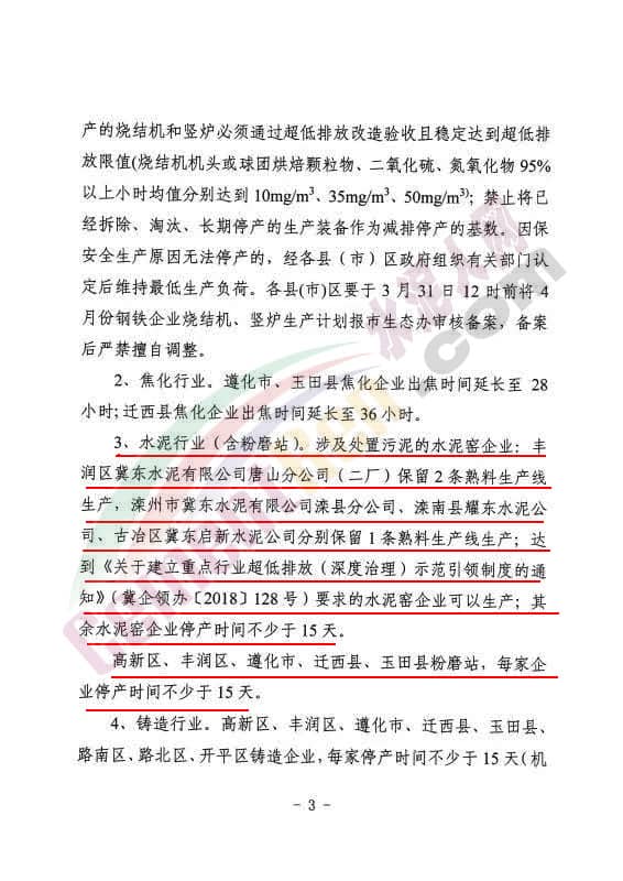 ?、筛咝聟^、豐潤區、遵化市、遷西縣、玉田縣粉磨站,每家企業停產時間不少于15天。