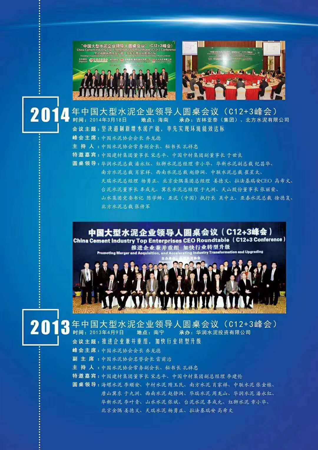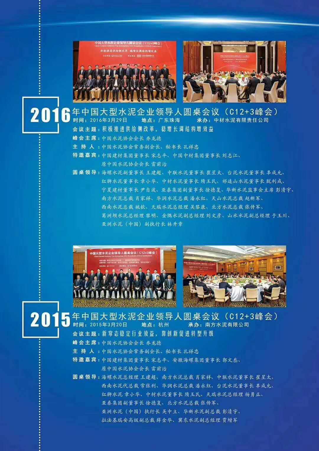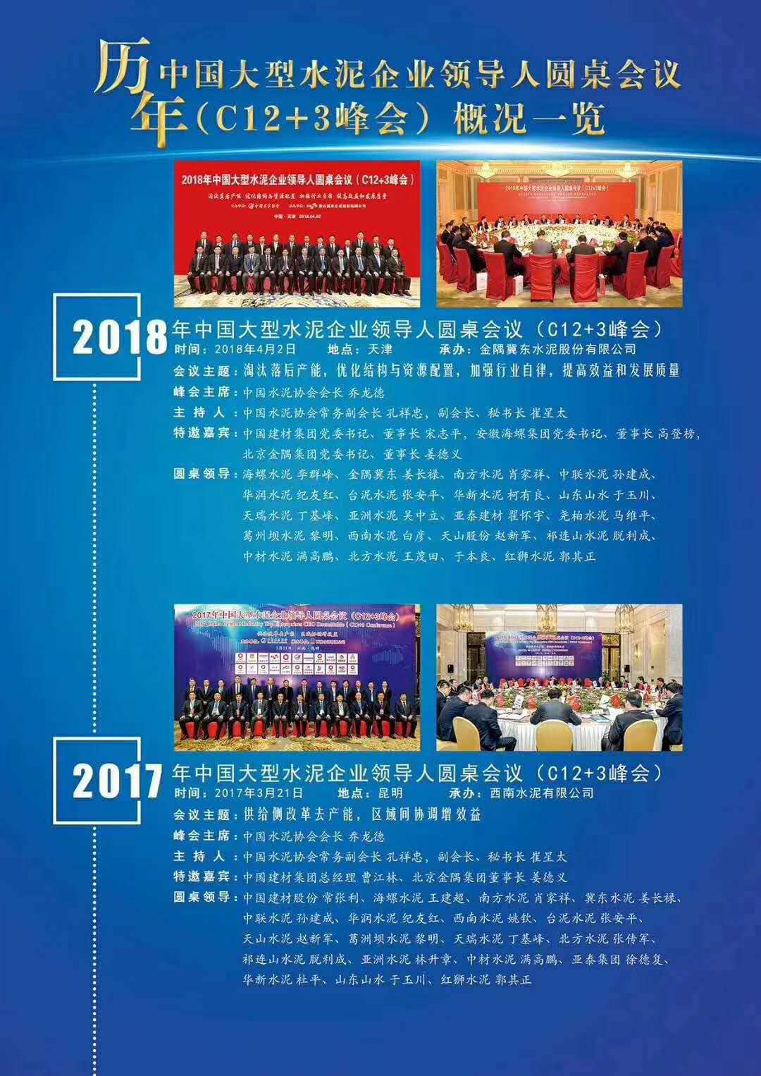 據(jù)水泥人網(wǎng)了解,中國大型水泥企業(yè)領(lǐng)導(dǎo)人圓桌會議(C12+3峰會)自2012年以來每年一屆,通常在每年的三月或四月份召開。