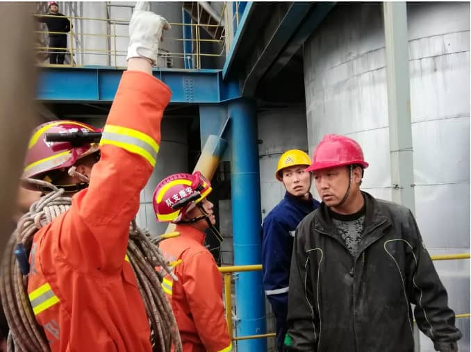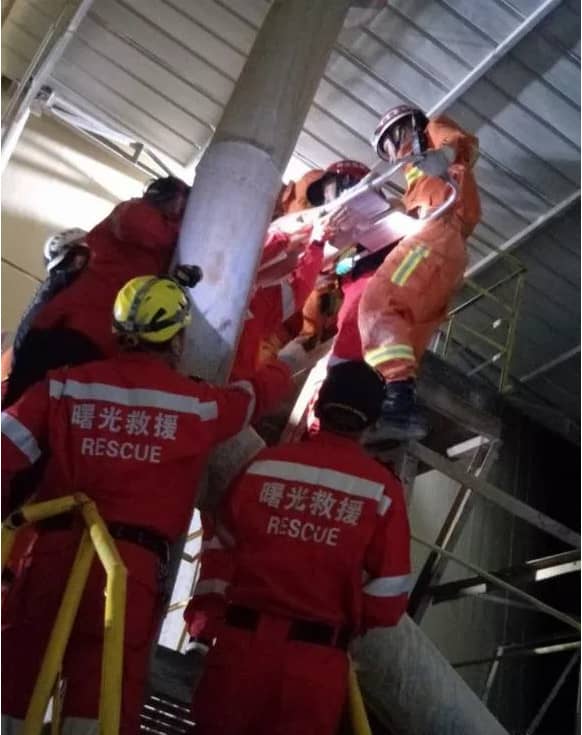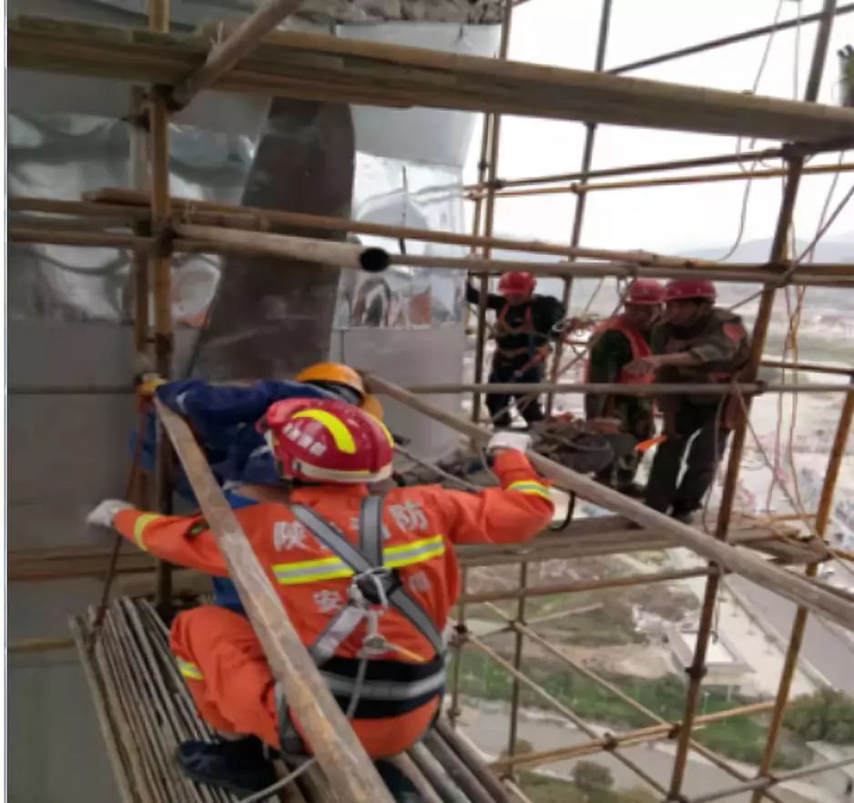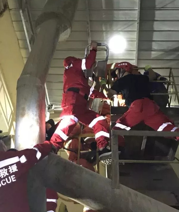 因得知被困人員所在的高空搭架離地面高度約80米,消防指揮員立即下令,由七名消防員攜帶擔架、攀登繩、掛鉤、四米小繩等前往事故發生位置,做緊急救援。