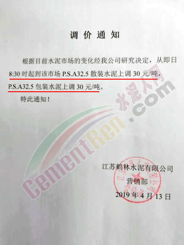 尊敬的客戶:您好!根據當前市場行情,我公司于2019年4月13日8:00,對各品種水泥價格上調30元/噸。特此通知!