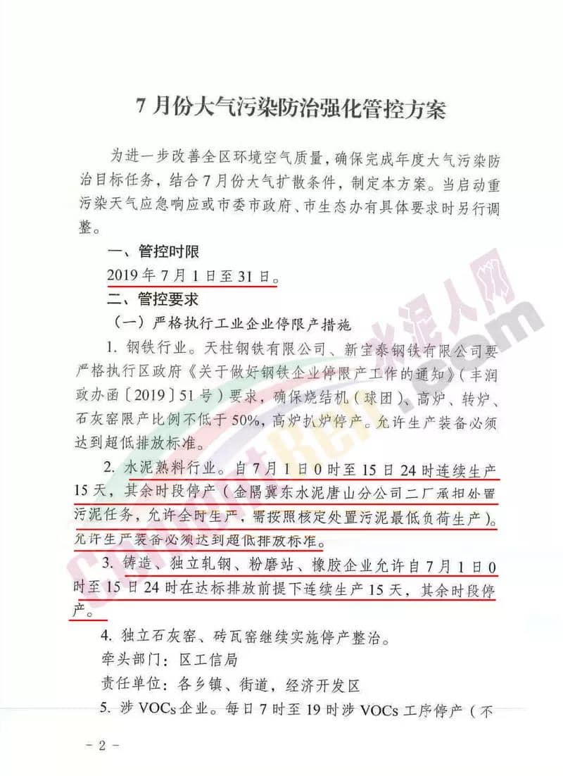 同時古冶區(qū)也發(fā)布了類似文件稱從2019年7月1日至31日對轄區(qū)水泥企業(yè)實施大氣污染防治強化管控。允許生產的鋼鐵、焦化、水泥企業(yè)必須達到超低排放標準;其余工業(yè)企業(yè)必須達標排放。制定停限產清單,明確到具體企業(yè)、具體裝備、具體時間段和限產產量,每家企業(yè)明確監(jiān)管單位、責任領導和監(jiān)管人員。