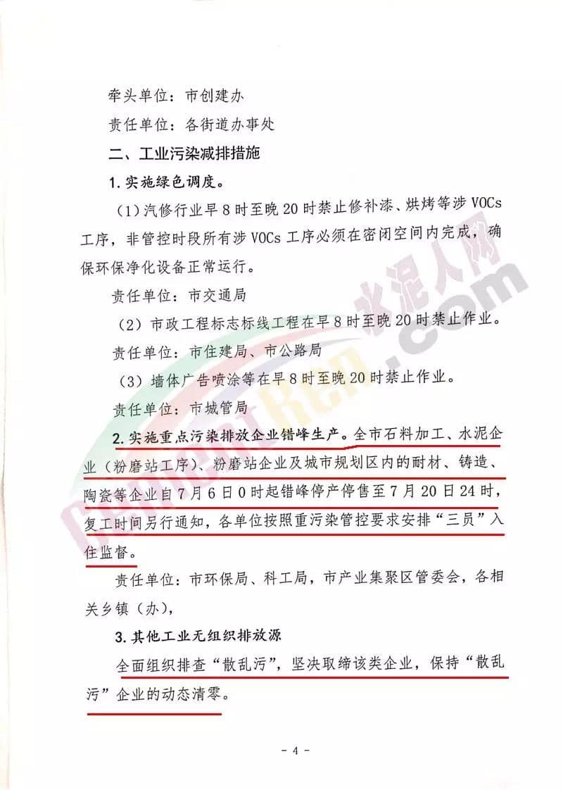 通知明確要求,禹州市全市石料加工、水泥企業(粉磨站工序)、粉磨站企業及城市規劃區內的耐材、鑄造、陶瓷等企業自7月6日0時起錯峰停產停售至7月20日24時,復工時間另行通知,各單位按照重污染管控要求安排“三員”入住監督。