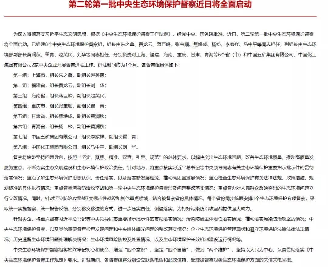 消息稱:為深入貫徹落實國家領導人生態文明思想,根據《中央生態環境保護督察工作規定》,經黨中央、國務院批準,近日,第二輪第一批中央生態環境保護督察將全面啟動。目前,已組建8個中央生態環境保護督察組,組長由朱之鑫、黃龍云、蔣巨峰、張寶順、焦煥成、楊松、李家祥、馬中平等同志擔任,副組長由生態環境部副部長黃潤秋、翟青、趙英民、劉華等同志擔任,分別負責對上海、福建、海南、重慶、甘肅、青海等6個省(市)和中國五礦集團有限公司、中國化工集團有限公司2家中央企業開展督察進駐工作,進駐時間約為1個月。將分別設立聯系電話和郵政信箱,受理來信來電舉報。各督察組具體如下: