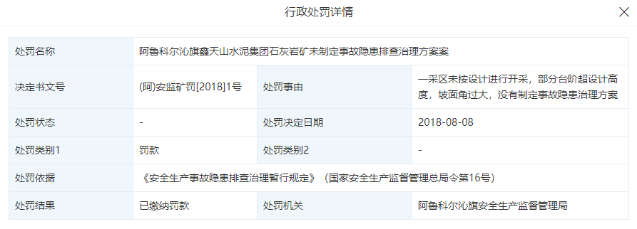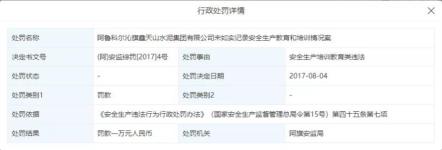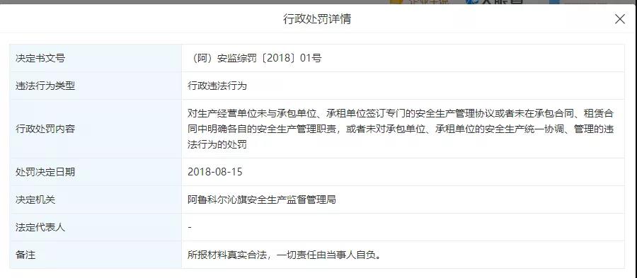 2017年8月4日,阿旗安監局曾針對企業未如實記錄安全生產教育和培訓情況做出行政罰,罰款一萬元人民幣。