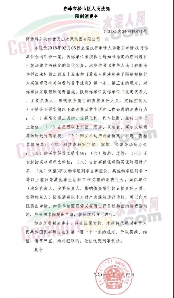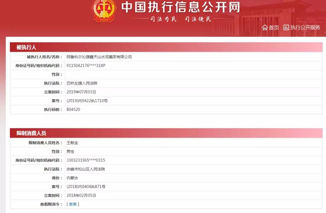 中國執行信息公開網信息顯示,被執行人為阿魯科爾沁旗鑫天山水泥集團有限公司,被限制消費人員為王獻金。
