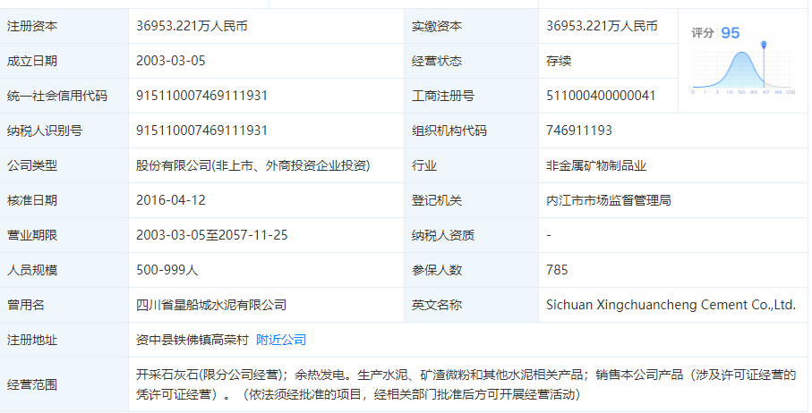 天眼查相關(guān)數(shù)據(jù)顯示:企業(yè)注冊(cè)地址位于資中縣鐵佛鎮(zhèn)高榮村,經(jīng)營(yíng)范圍為開采石灰石,余熱發(fā)電,生產(chǎn)水泥,礦渣微粉和其他水泥相關(guān)產(chǎn)品。