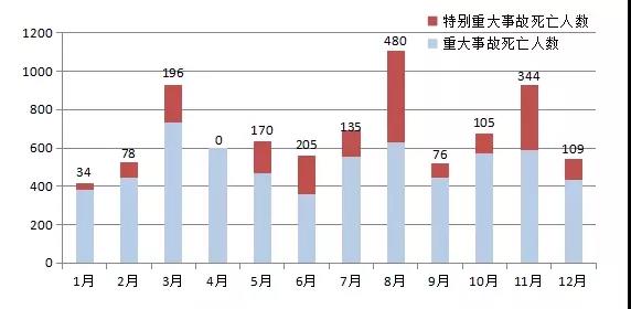 其中,特別重大事故在近十年的8月份發(fā)生最為集中,共發(fā)生8起、死亡480人,占近十年特別重大事故起數(shù)、死亡人數(shù)的20.0%、24.8%;分別比全年月平均值高出11.7和16.5個(gè)百分點(diǎn),在12個(gè)月份中均位列第一位。